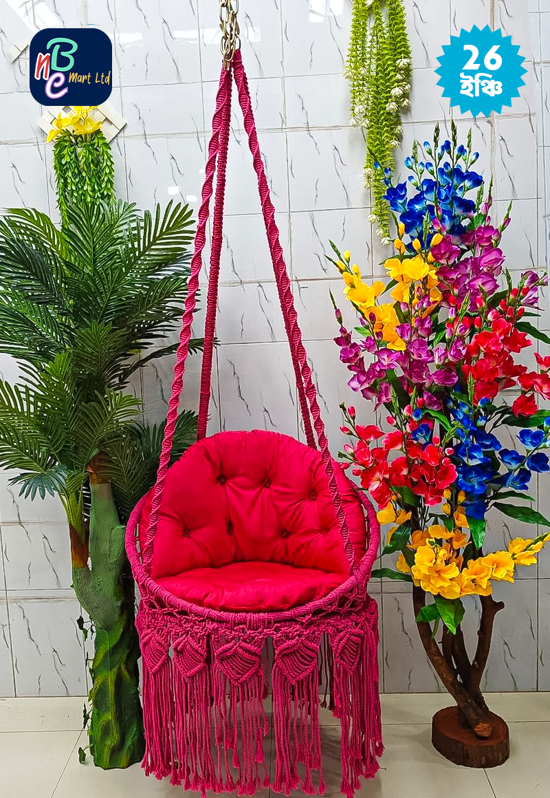 পণ্য বিবরণী: • ধরণ: ম্যাক্রোম হ্যান্ডক্র্যাফটেড চেয়ার দোলনা। • আকার: ২৬ ইঞ্চি (প্রশস্ত সিট)। • উপাদান: উচ্চমানের কটন রোপ এবং শক্তিশালী মেটাল ফ্রেম। • সেট: দোলনা, ১টি বসার গদি, ১টি হেলান দেওয়ার গদি, ১টি শিকল, ১টি ঝুলানোর অ্যাঙ্কর ও রয়্যাল বোল্ট