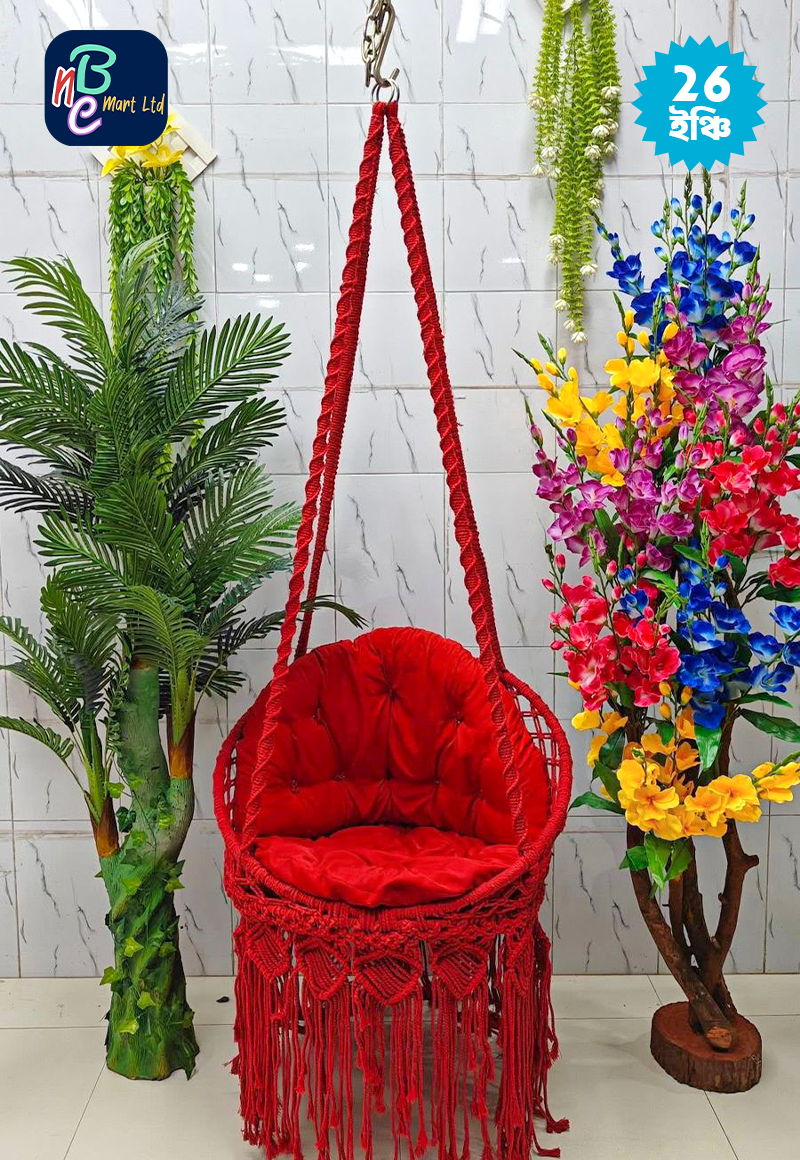 পণ্য বিবরণী: • ধরণ: ম্যাক্রোম হ্যান্ডক্র্যাফটেড চেয়ার দোলনা। • আকার: ২৬ ইঞ্চি (প্রশস্ত সিট)। • উপাদান: উচ্চমানের কটন রোপ এবং শক্তিশালী মেটাল ফ্রেম। • সেট: দোলনা, ১টি বসার গদি, ১টি হেলান দেওয়ার গদি, ১টি শিকল, ১টি ঝুলানোর অ্যাঙ্কর ও রয়্যাল বোল্ট