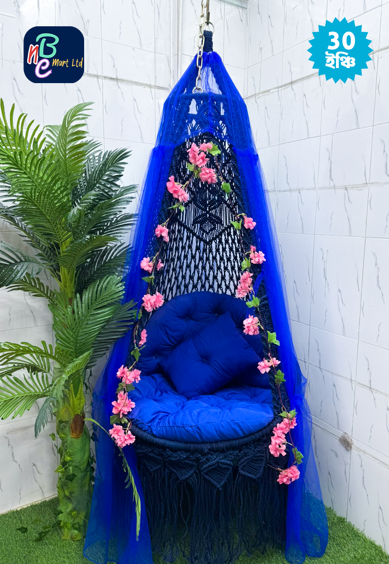 পণ্য বিবরণী: • ধরণ: ম্যাক্রোম হ্যান্ডক্র্যাফটেড চেয়ার দোলনা। • আকার: ৩০ ইঞ্চি (প্রশস্ত সিট)। • উপাদান: উচ্চমানের কটন রোপ এবং শক্তিশালী মেটাল ফ্রেম। • সেট: ১টি বসার গদি, ১টি হেলান দেওয়ার গদি, ২টা ফুল, ১টা মশারি, ১টি ঝুলানোর S অ্যাঙ্কর, শিকল ও রয়্যাল বোল্ট।