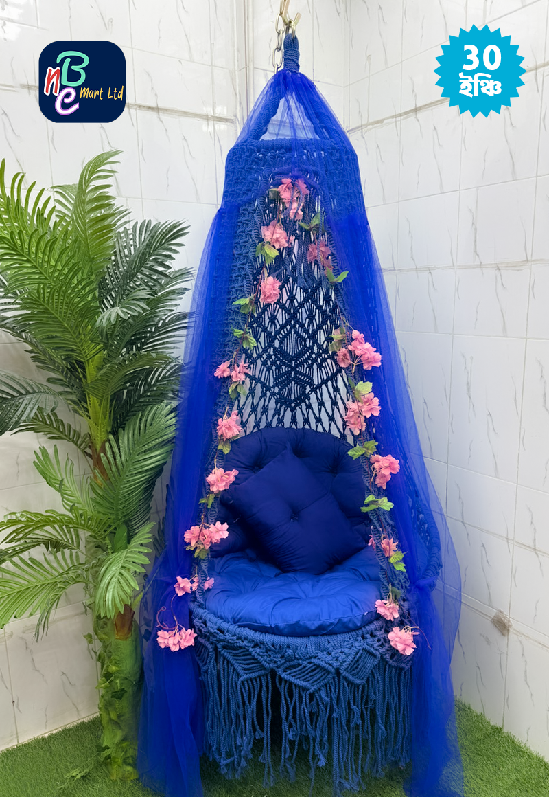 • ধরণ: ম্যাক্রোম হ্যান্ডক্র্যাফটেড চেয়ার দোলনা। • আকার: ৩০ ইঞ্চি (প্রশস্ত সিট)। • উপাদান: উচ্চমানের কটন রোপ এবং শক্তিশালী মেটাল ফ্রেম। • সেট: ১টি বসার গদি, ১টি হেলান দেওয়ার গদি, ২টা ফুল, ১টা মশারি, ১টি ঝুলানোর S অ্যাঙ্কর, শিকল ও রয়্যাল বোল্ট।
