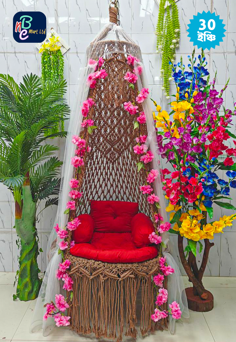 পণ্য বিবরণী: • উপাদান: উচ্চমানের কটন রোপ ও শক্ত লোহার ফ্রেম। • সাইজ: ৩০ ইঞ্চি (বসার স্থান)। • ধরণ: ম্যাক্রোম হ্যান্ডক্র্যাফটেড হ্যাঙ্গিং সুইং। সাথে যা যা থাকছে: ১টি বসার গদি, ২টি সাইড পিলো, ১টি হেড পিলো, ২টি চাইনিজ আর্টিফিশিয়াল ফুল, ১টি মশারি ১টি ঝুলানোর অ্যাঙ্কর, ২ টি রয়েল বোল্ট ও ১টি শিকল