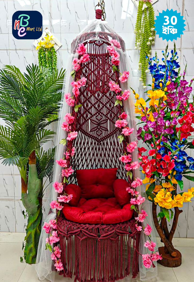 পণ্য বিবরণী: • উপাদান: উচ্চমানের কটন রোপ ও শক্ত লোহার ফ্রেম। • সাইজ: ৩০ ইঞ্চি (বসার স্থান)। • ধরণ: ম্যাক্রোম হ্যান্ডক্র্যাফটেড হ্যাঙ্গিং সুইং। সাথে যা যা থাকছে: ১টি বসার গদি, ২টি সাইড পিলো, ১টি হেড পিলো, ২টি চাইনিজ আর্টিফিশিয়াল ফুল, ১টি মশারি ১টি ঝুলানোর অ্যাঙ্কর, ২ টি রয়েল বোল্ট ও ১টি শিকল