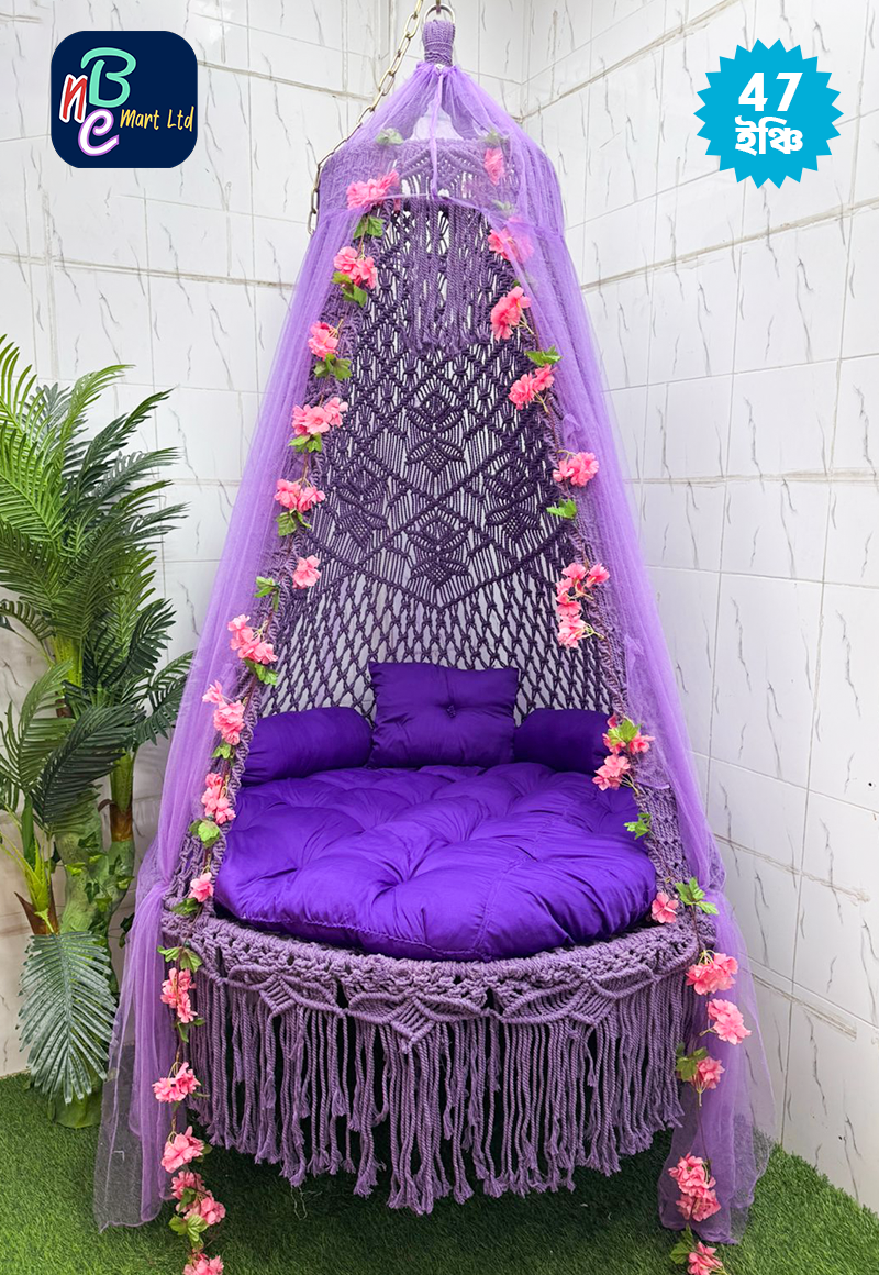 • উপাদান: উচ্চমানের কটন রোপ ও শক্ত লোহার ফ্রেম। • সাইজ: ৪৭ ইঞ্চি (বসার স্থান)। • ধরণ: ম্যাক্রোম হ্যান্ডক্র্যাফটেড হ্যাঙ্গিং সুইং। • সেট: ১টি বসার গদি, ২টি সাইড পিলো, ১টি হেড পিলো, ২টি চাইনিজ আর্টিফিশিয়াল ফুল, ১টি মশারি ১টি ঝুলানোর অ্যাঙ্কর, ২ টি রয়েল বোল্ট ও ১টি শিকল।