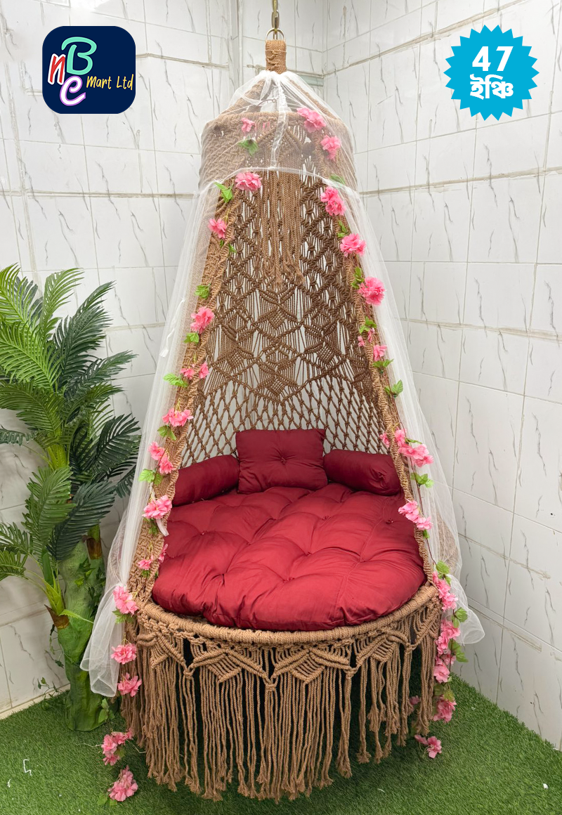 • উপাদান: উচ্চমানের কটন রোপ ও শক্ত লোহার ফ্রেম। • সাইজ: ৪৭ ইঞ্চি (বসার স্থান)। • ধরণ: ম্যাক্রোম হ্যান্ডক্র্যাফটেড হ্যাঙ্গিং সুইং। • সেট: ১টি বসার গদি, ২টি সাইড পিলো, ১টি হেড পিলো, ২টি চাইনিজ আর্টিফিশিয়াল ফুল, ১টি মশারি ১টি ঝুলানোর অ্যাঙ্কর, ২ টি রয়েল বোল্ট ও ১টি শিকল।