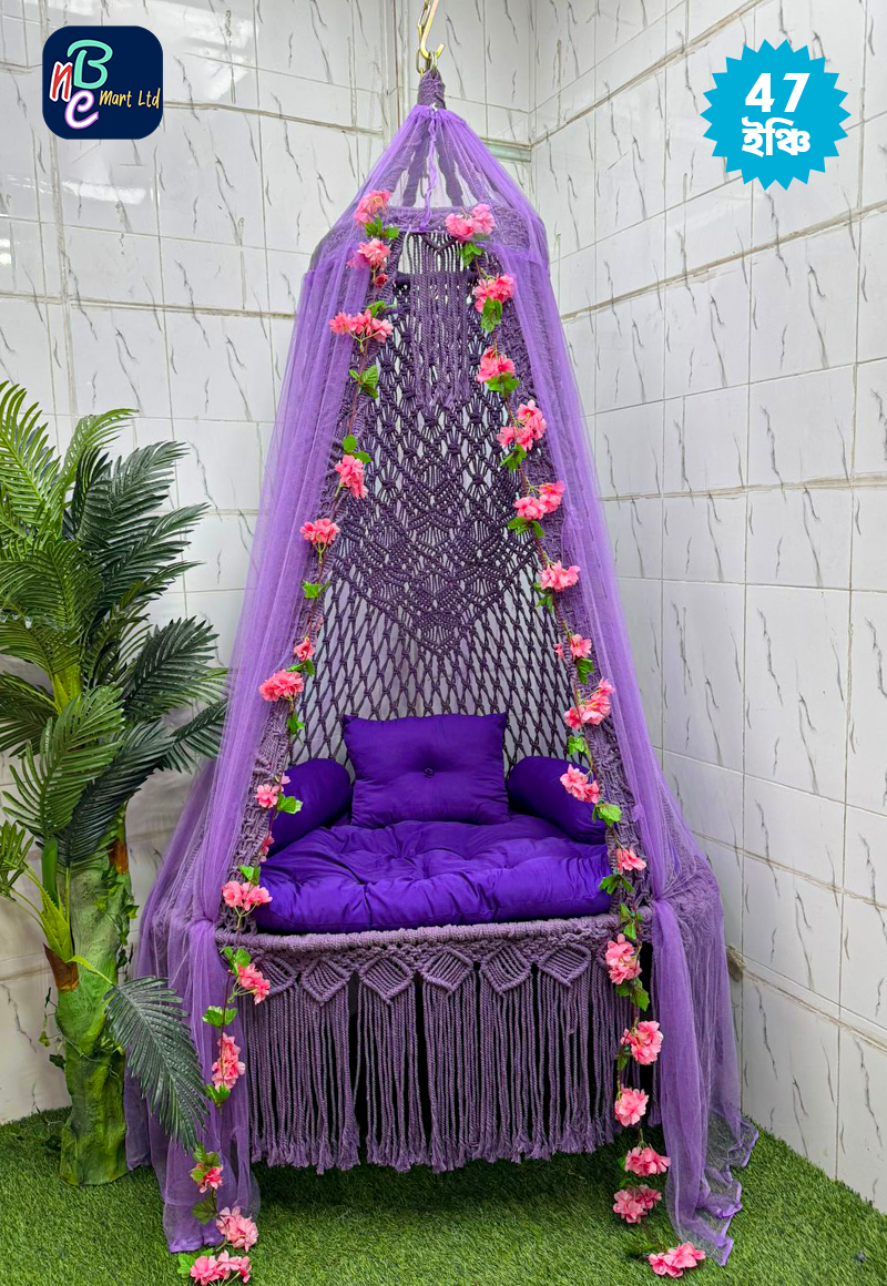 • বিশাল ও প্রশস্ত: ৪৭ ইঞ্চি চওড়া এই দোলনাটিতে সোফার মতো আরাম করে ২ জন অনায়াসে বসতে পারেন। • মজবুত কটন বুনন: ১০০% উন্নত মানের কটন সুতা দিয়ে তৈরি। • সাথে যা যা থাকছে: ১টি বসার গদি, ২টি সাইড পিলো, ১টি হেড পিলো, ২টি চাইনিজ আর্টিফিশিয়াল ফুল, ১টি মশারি ১টি ঝুলানোর অ্যাঙ্কর, রয়েল বোল্ট ও শিকল।